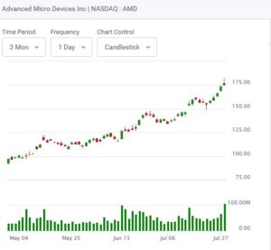 Advanced Micro Devices Inc. (AMD) was one of the better-performing stocks today. Today, the stock gained 2.18% or $3.78 to close at $177.44 with 108M shares changing hands. AMD stock  definitely has more room to grow.