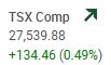 The TSX composite index gained 134.46 points or 0.49%, to close the session at 27,405.42.  The total volume of shares traded was up 5% compared to yesterday.