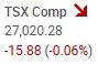 The TSX composite index declined -15.88 points or -0.06%, to close the session at 27,020.28. There was some volatility during the session, but most of the time the TSX remained and closed above the 27,000 level.