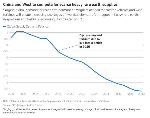 But shortages of heavy elements dysprosium and terbium could be an Achilles heel for MP Materials and the West’s campaign to forge a magnets industry away from geopolitical turbulence that has constricted supply from China, analysts say.