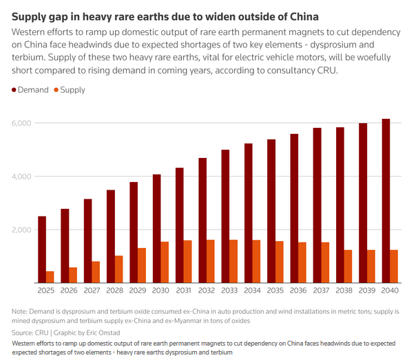 Despite the flurry of recent deals and rhetoric in the West, mines outside of China are forecast to meet only 29% of the heavy rare earths consumed outside China in the auto and wind sectors by 2035, according to data from London-based commodity consultancy CRU.