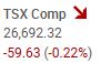 The TSX composite index declined -59.63 points or -0.22%, to close the session at 26,692.32.