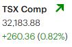 The S&P/TSX Composite Index rose 260.36 points, or 0.82%, to close at 32,183.88. The index climbed steadily from the opening bell and remained well above Friday’s closing level throughout the session, even gaining an additional 100 points during the final hour of trading. This marked a strong rebound following Friday’s sell-off.