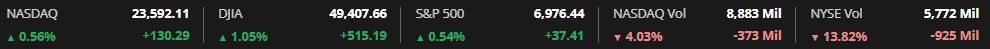 The Dow Jones Industrial Average advanced 515.19 points, or 1.05%, to close at 49,407.66. The S&P 500 gained 37.41 points, or 0.54%, ending the session at 6,976.44, while the Nasdaq Composite rose 130.29 points, or 0.56%, to finish at 23,592.11.