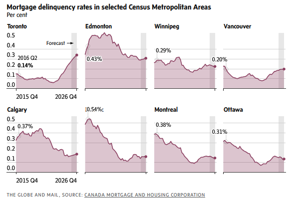 The rate of mortgages in arrears in Toronto is forecast to climb to 0.34 per cent by the end of 2026, although other cities like Ottawa, Montreal and Winnipeg are expected to have mortgage arrears peak in mid-2026 before decreasing.