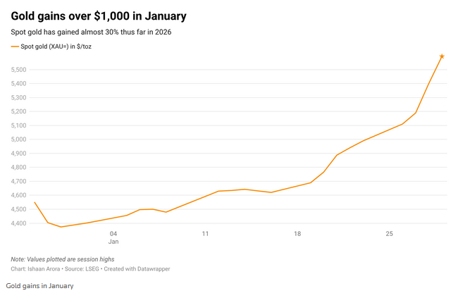 Spot gold rose 2.2% to $5,516.71 an ounce by 0947 GMT, after hitting a record $5,594.82 earlier in the day. The metal, which has hit record highs for nine straight sessions, was set for a 28% rise for the month so far.