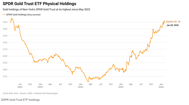 SPDR Gold Trust , the world’s largest gold-backed exchange-traded fund, said its holdings on Wednesday rose to 35,043,181 ounces, its highest since May 2022.