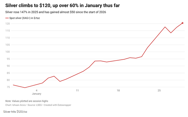 Silver also benefited from the flight to safety, leaping above the $120 level.