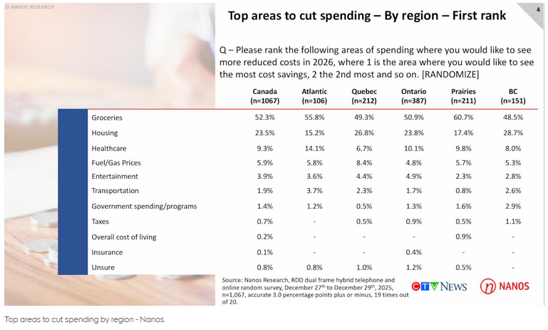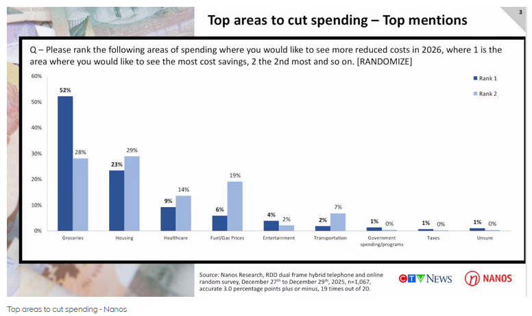 The survey focused on areas of spending where Canadians would like to see more reduced costs in 2026