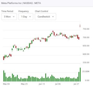 Meta Platforms (META) stock soared yesterday after the company delivered its second quarter earnings report that beat and clearly exceeded all expectations. The reports showed that revenue growth was accelerating. The company has a strong sales forecast and raised its outlook slightly for total spending. Meta Platforms reported an adjusted $7.14 per share for the June-ended quarter, up 38% from a year earlier. The META stock gained 11.25% or $78.23, closing the market session at $773.44. Meta Platforms stock is worth adding to your watchlist.