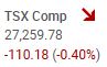 The TSX composite index declined -110.18 points or -0.40%, to close the session at 27,259.78. The total volume of shares traded today was twenty per cent, or one fifth more, than the volume of shares traded yesterday.