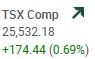 The TSX composite index was up 174.44 points or 0.69%, to close the session at 25,532.18. The TSX is up four consecutive sessions.