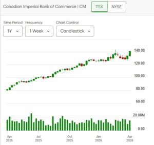 Financials continue to attract attention, particularly Canada’s “Big Six” banks. Four of the six have posted six consecutive sessions of gains since March 30, reflecting renewed buying interest following weakness in March tied to geopolitical uncertainty stemming from the Middle East conflict.