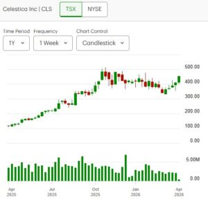 - Celestica Inc. extended its recent momentum, rising 2.25% to close at $453.07, following strong gains in the prior session.