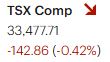 The S&P/TSX Composite Index declined 142.85 points (-0.42%) to close at 33,477.71, underperforming after six consecutive sessions of gains. The index opened higher but quickly reversed, dropping approximately 200 points within the first hour—an indication of early-session distribution and profit-taking. Price action remained negative throughout the day, with no sustained intraday recovery.