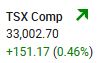 The S&P/TSX Composite Index advanced 151.17 points, or 0.46%, to close at 33,002.70. The index has now finished higher in eight of the past nine trading sessions. As the TSX is heavily weighted toward mining and resource companies, it tends to outperform during periods of strong demand for precious and industrial metals.