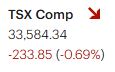 The S&P/TSX Composite Index fell 233.85 points (-0.69%) to close at 33,584.34. The index opened lower but briefly climbed above its opening level before dropping roughly 200 points—all within the first ninety minutes of trading.