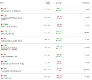 Industry Groups:  The top five industry groups in the TSX today were: Auto & Truck Manufacturers, up 10.10%; Advertising / Marketing, 8.57%; Advanced Medical Equipment, up 4.45%; Auto / Truck / Motorcycle Parts, up 3.47%; Construction Materials, up 3.25%.
