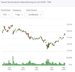 President Trump arrived in Saudi Arabia yesterday. Nvidia Corp’s (NVDA) CEO was part of the trade team on the trip. It was announced later that Nvidia has secured the deal to be the main chip supplier to the proposed big Saudi data center project. The deal lifted a number of other AI suppliers’ stocks. Super Micro Computer Inc. (SMCI) was up 16% or $5.37% to close at $38.89 with 96.75M shares traded. Broadcom Inc. (AVGO) stock was up 4.9% or $10.84 to close at $232.42 with 28M shares traded. Taiwan Semiconductor Manufacturing Co Ltd (TSM) is completing the right side of a cup with a handle pattern.
