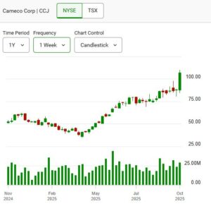 Cameco’s Canadian-listed shares (CCO) surged 22.86% (C$27.72) to close at C$148.98, with 3.2 million shares traded. On the U.S. market, CCJ shares advanced 23.24% (US$20.29) to close at US$106.91, with 24 million shares changing hands.