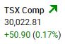The TSX Composite Index rose 50.90 points, or 0.17%, closing the session at 30,022.81. The index reached a milestone today. It closed above the 30,000 level for the first time.