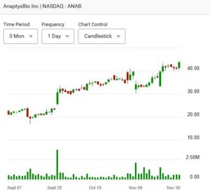 • AnaptysBio Inc. (ANAB) surged 6.99% ($2.86) to close at $43.76 on 599,000 shares traded.