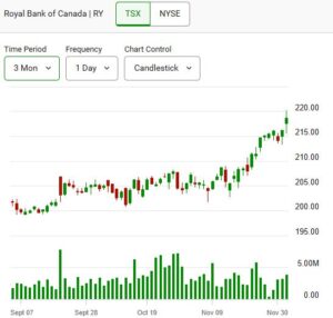 Royal Bank of Canada (TSX: RY) advanced 1.12% ($2.43), reaching a new 52-week high. The bank continues to exhibit strong price momentum, extending a steady upward trend that began on November 14. RY offers a quarterly dividend with a yield of approximately 2.82%. While the technical setup remains constructive, caution is warranted, as no sustained rally is without eventual consolidation.