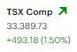 The S&P/TSX Composite Index rose 493.18 points, or 1.50%, to close at 33,389.73. The Toronto market opened higher and continued to climb throughout the session, reflecting strong positive momentum. The index finished well above the day’s low, underscoring sustained buying interest.