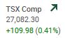 The TSX composite index gained 109.98 points or 0.41%, to close the session at 27,082.30. TSX is back gaining mode now with consecutive sessions of market gains.