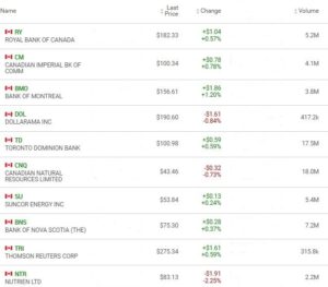 Industry Groups: The top five industry groups in the TSX today were: Auto & Truck Manufacturers, up 11.32%; Paper Products, up 6.01%; Beverages – Non Alcoholic, up 4.65%; Publishing, up 4.51%; and Pharmaceuticals – Generic & Specialty, up 4.13%.