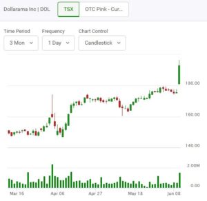 Dollarama Inc. (TSX: DOL) announced today that it plans to open 70 to 80 net new stores in the country this fiscal year. The company plans to keep its prices steady and accelerate store growth to meet strong demand in the country despite tariffs and inflationary pressure, which may weigh on the retail landscape. Dollarama stock hit a new 52-week high today, surpassing its previous peak of C$179.71. The retail stocks sector was the top sector in the TSX today.