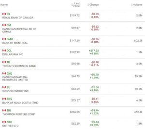 Industry Groups: The top five industry groups in the TSX today were: Auto & Truck Manufacturers, up 14.71%; Retail – Discount Stores, 9.80%; Electrical Components & Equipment, up 4.63%; Chemicals Commodity, up 3.25%; IT Services & Consulting, up 2.92%.
