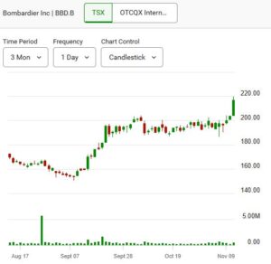 Bombardier Inc. (TSX: BBD.B) was again among the session’s strongest performers, surging 6.48% ($3.79) to $216.99 on 223,500 shares traded.