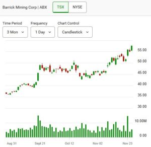 Further down the list, NexGen Energy Ltd. (TSX: NXE), Aecon Group Inc. (TSX: ARE), Boyd Group Services Inc. (TSX: BYD), and Ero Copper Corp. made notable appearances. Franco-Nevada Corp., which received an analyst upgrade earlier in the day, also ranked among the stronger performers, appearing roughly two-thirds of the way down the leaderboard. Shopify Inc (TSX: SHOP) is up five consecutive sessions and is in recovery mode from sharp and downturn in late October and early this month.