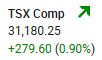 The S&P/TSX Composite Index advanced 279.60 points (+0.90%) to 31,180.25, further extending the upward trend that began on Friday. Now registering four consecutive sessions of gains. Volume of shares traded was down today but decline in volume today was not close to the decrease recorded yesterday. There was also broad-based sector participation today but a bit less broad based compared to yesterday’s market.
