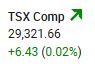 The TSX Composite Index gained 6.43 points, or 0.02%, closing the session at 29,321.66.