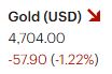 Gold and Silver: Gold is down $52.20, or 1.10%, to $4,734.40 per troy ounce. Silver is down $2.22, or 2.90%, to $74.23 per ounce as of 11:00 PM EST Sunday.