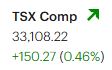 The S&P/TSX Composite Index rose 150.27 points, or 0.46%, to close at 33,108.22, marking its third consecutive session of gains. This upward momentum is worth monitoring as a potential rally develops.