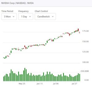 Nvidia Corp (NVDA) declined Friday, -2.33% or $4.15, closing at $173.72 with 204.5M shares traded. NVDA stock closed at $113.54 on May 5. That is a decent profit in three months. If the market continues the recent downtrend, of course it will be smart to convert the paper profit into bankable money. Is Nvidia a sell? We say No, not yet. Should you buy NVDA stock now? The stock is certainly not extended and is not a stock with a high daily volatility, or what is sometimes referred to as Average True Range (ATR). We will keep an eye on NVDA stock for our readers. The stock may likely go through some consolidation before the next leg up.