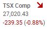 The TSX composite index declined -239.35 points or -0.88%, to close the session at 27,020.43. The TSX has now suffered three consecutive sessions of three digit declines. The market’s decline today was quite bearish.