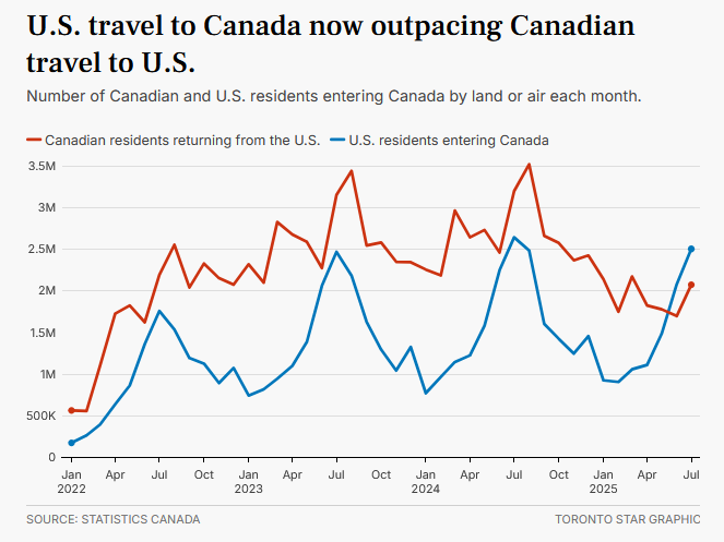 The shift marks the first time cross-border visitor traffic between the two countries has reversed in more than 20 years, except for a period during the pandemic lockdown.