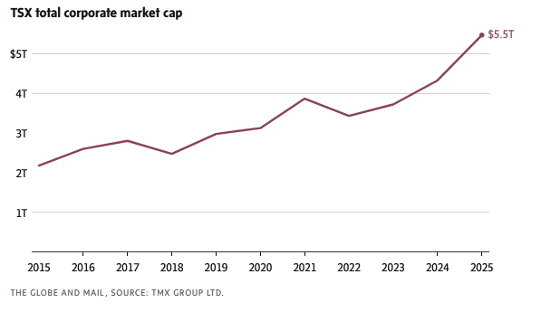 Despite the declining number of issuers in the TSX, the total market value of the companies that remain in public markets has steadily risen. The combined market capitalization of TSX-listed companies grew by more than $1-trillion in 2025, representing a 26-per-cent increase in a single year.